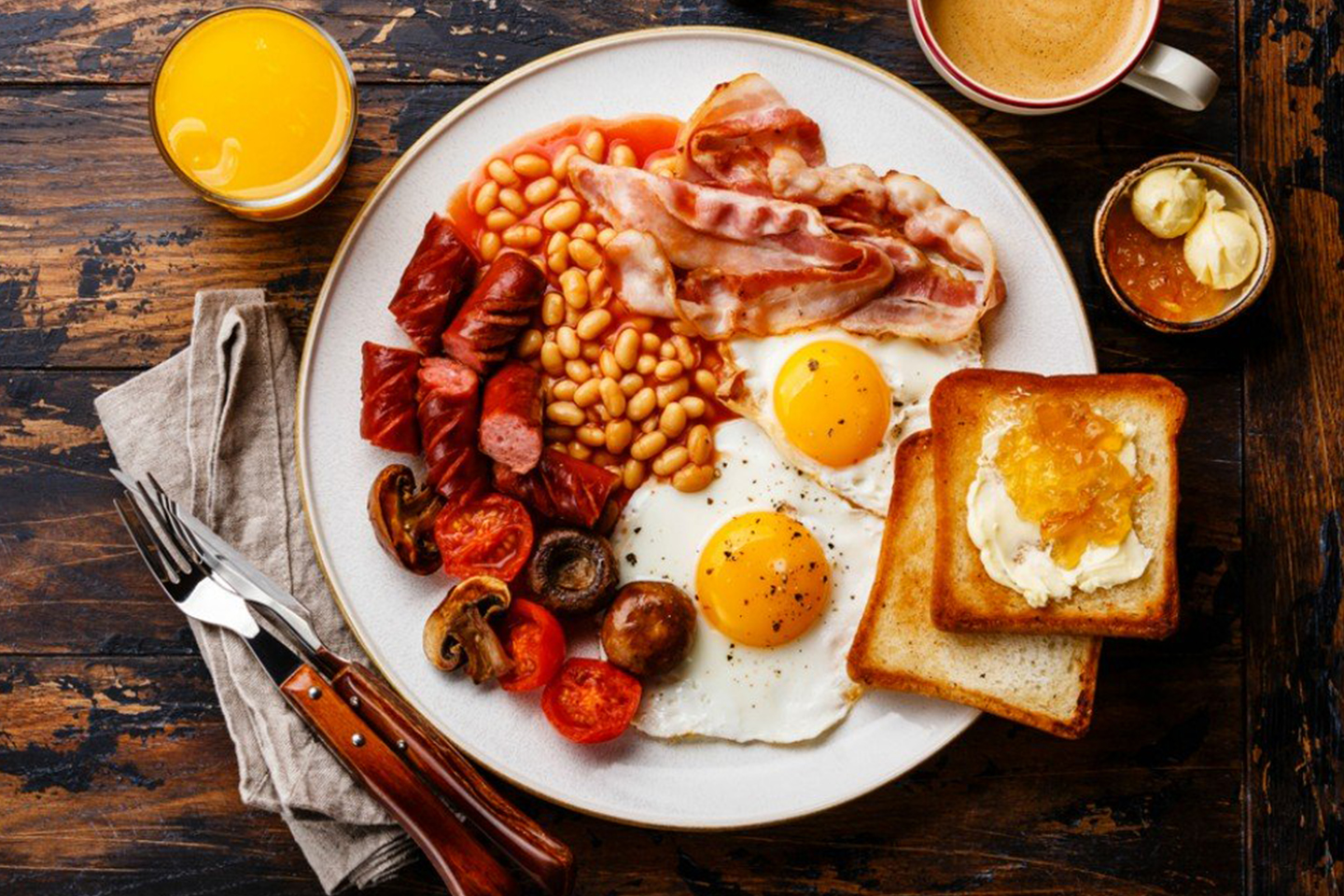 The English breakfast includes fried, scrambled or poached eggs, bacon, sausages, toast and butter. Some variations include roasted tomatoes and mushrooms, French fries, baked beans, and scallops.