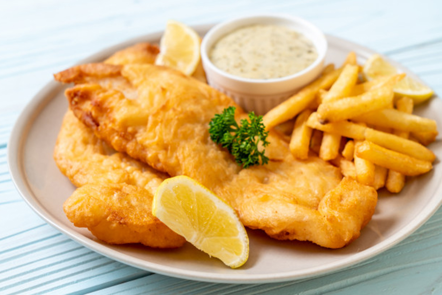 The necessary ingredients are white fish fillets, wheat flour, beer, yeast or baking powder, potatoes, oil, salt, vinegar.