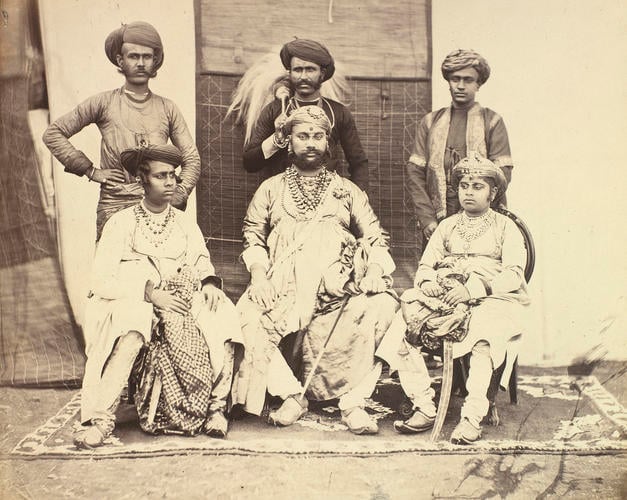 The Maharajah and his son in one of the Rawal rooms with members of the royal guard.
