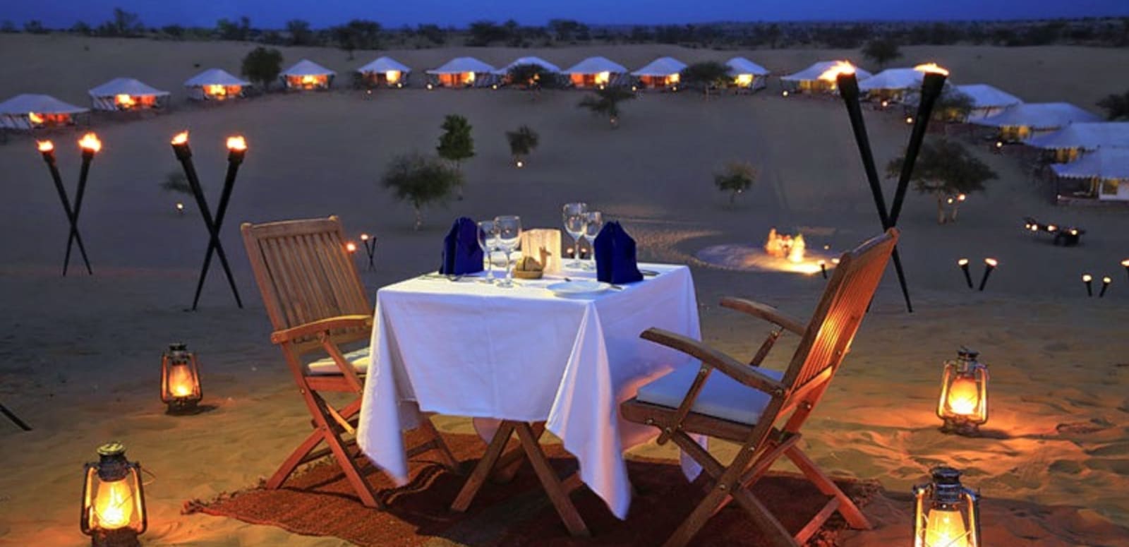 Gala dinner in the Thar desert, near the city of Bikane, illuminated by a bonfire and animated by traditional dances.