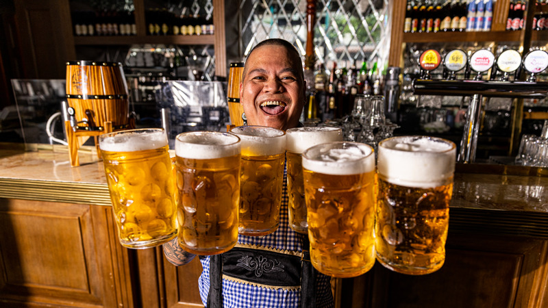 Get ready to enjoy good beer and traditional non-vegetarian German food: sausages, pâtés, knuckles and much more.