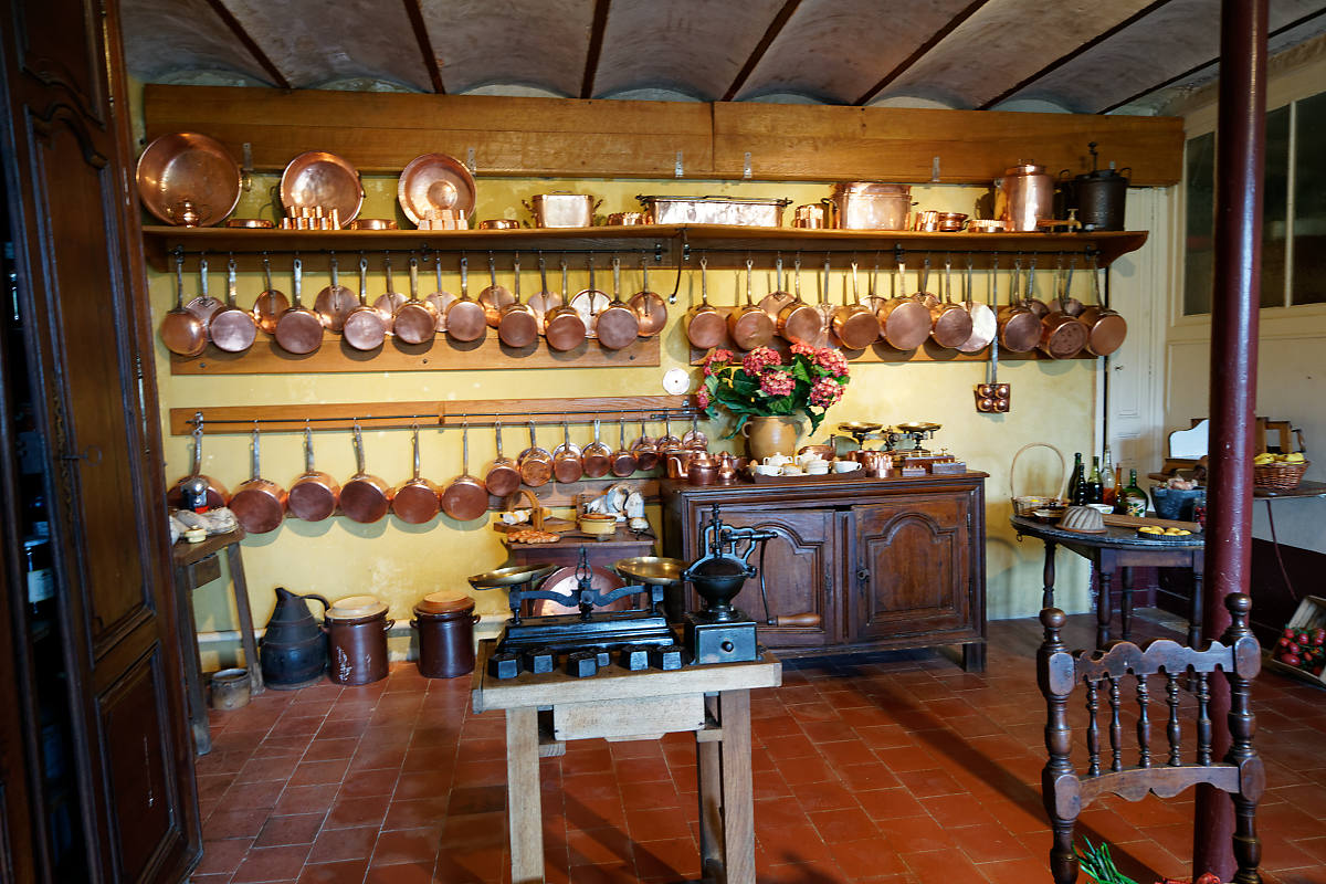 More than 150 copper objects make the kitchen also a real museum, with other curiosities such as a sorbet maker or a coffee roaster from the beginning of the 20th century.